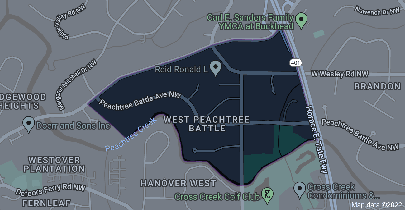 Wesley Battle is a neighborhood in the northwest of Atlanta containing roughly 250 homes. Its perimeter is Moores Mill Road from Peachtree Creek to I-75, Peachtree Battle from Moores Mill Road to I-75 and Bohler Road from West Wesley to Peachtree Creek. The Neighborhood also includes Peachtree Battle Place, Dobbs Circle, Bohler Court and Battleview Drive.
